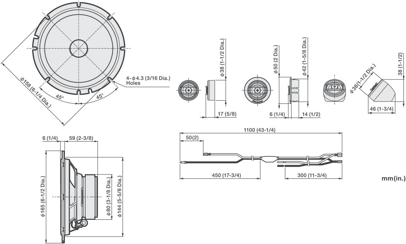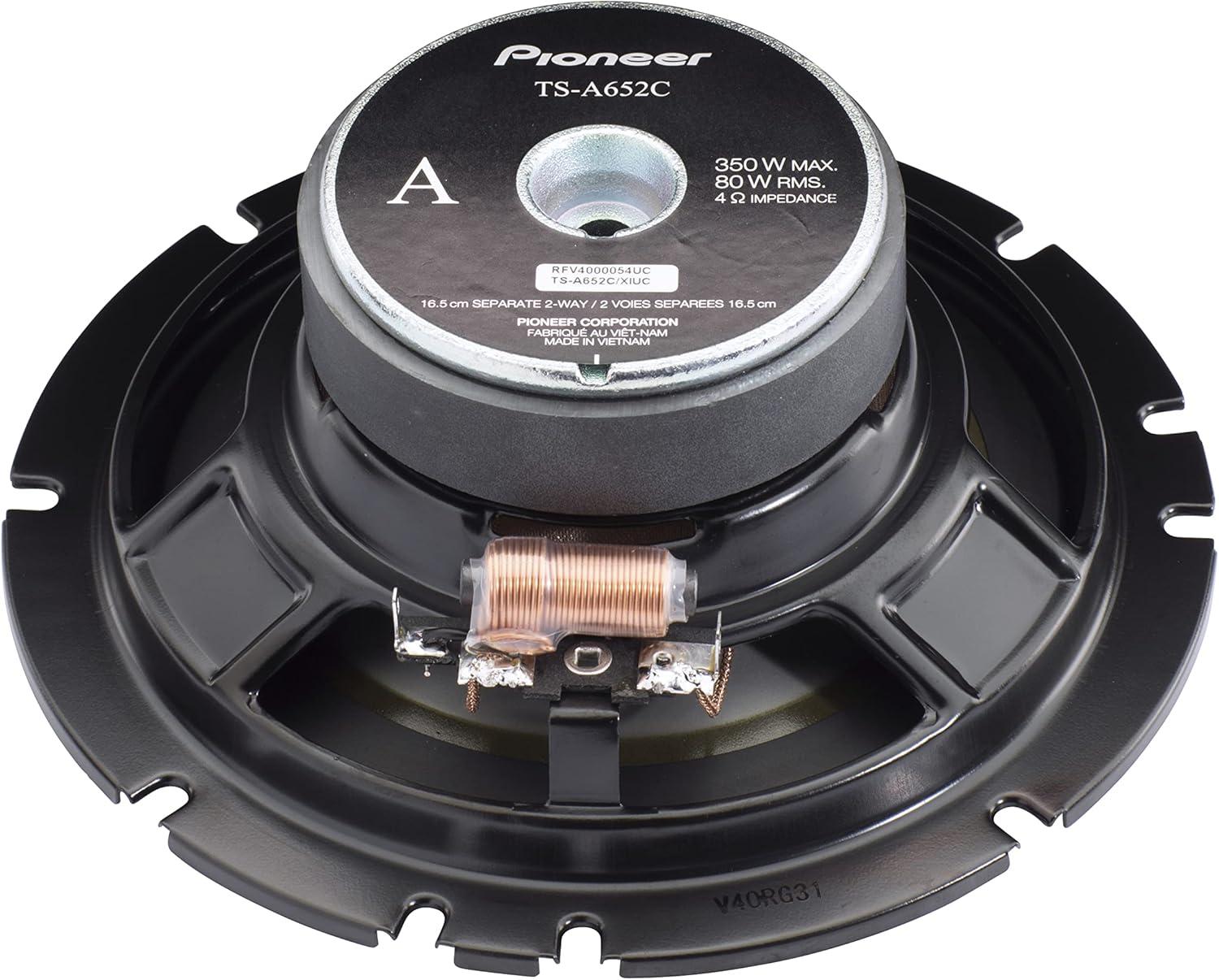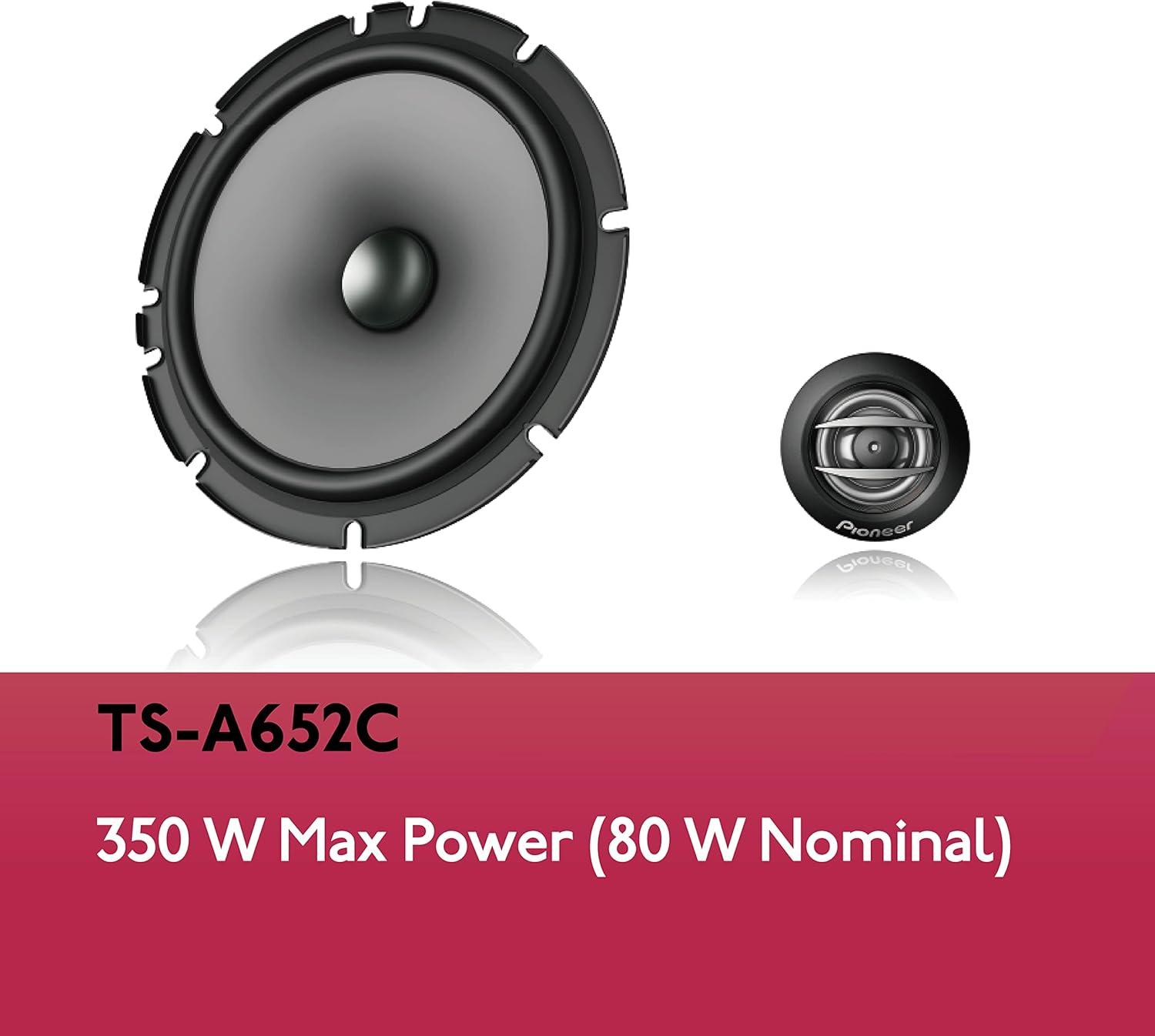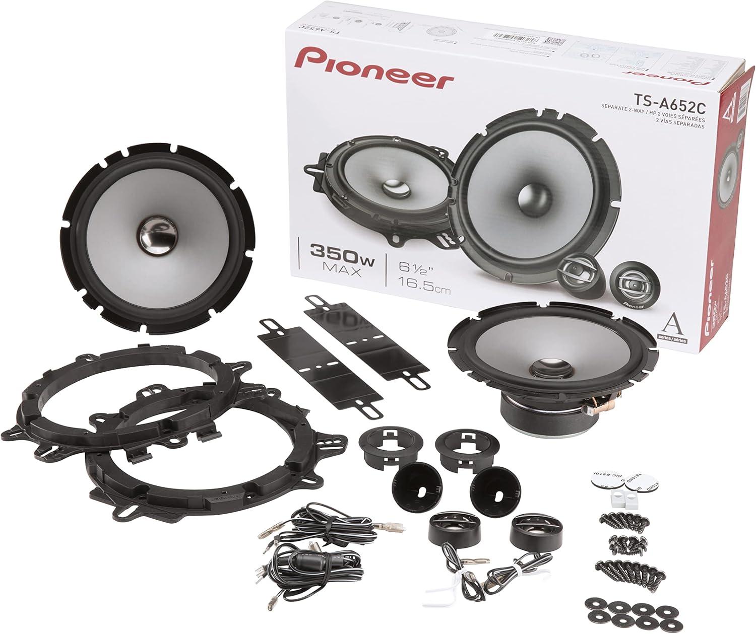Upgrade your car's audio system with the Pioneer TS-A652C 2-Way Car Speakers. These speakers are designed to deliver enhanced sound quality and performance, allowing you to enjoy your favorite music like never before. These speakers are a popular choice for many car models. Included with the component system are 6-1/2″ multi-fit installation adapters that expand flexibility and improve acoustic performance. Also included are tweeter mounts for surface mounting, flush mounting and specially designed multi-fit adapters for mounting in original equipment (OE) tweeter locations. With the integrated/in-line crossover network, you increase installation flexibility without the need of an outboard module. The included Pioneer multi-fit installation adapters can be easily modified to fit a variety of different applications by simply breaking off or cutting off the easy to remove tabs until the shape and mounting points match the original speaker. Replacing your factory speakers has never been easier. With a maximum power handling of 350 watts and a continuous power handling of 80 watts, the TS-A652C can handle higher power levels, allowing you to enjoy louder and more dynamic audio. The speakers are designed to deliver impressive volume levels without sacrificing clarity or causing distortion. Upgrade your car's audio system with the Pioneer TS-A652C 2-Way Component Speaker System. Experience improved sound quality, enhanced bass, and clear vocals, bringing your music to life on the road. Enjoy the Pioneer quality and elevate your in-car audio experience.