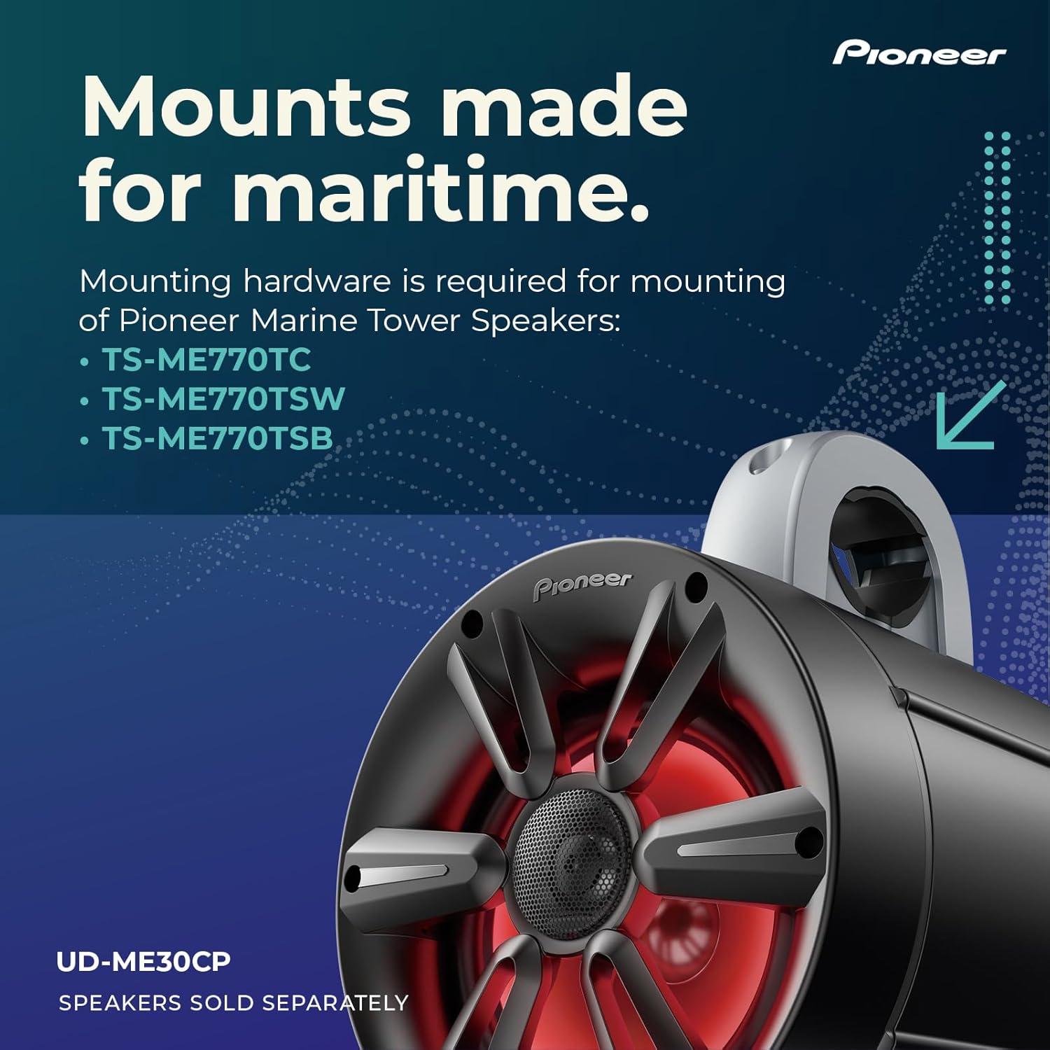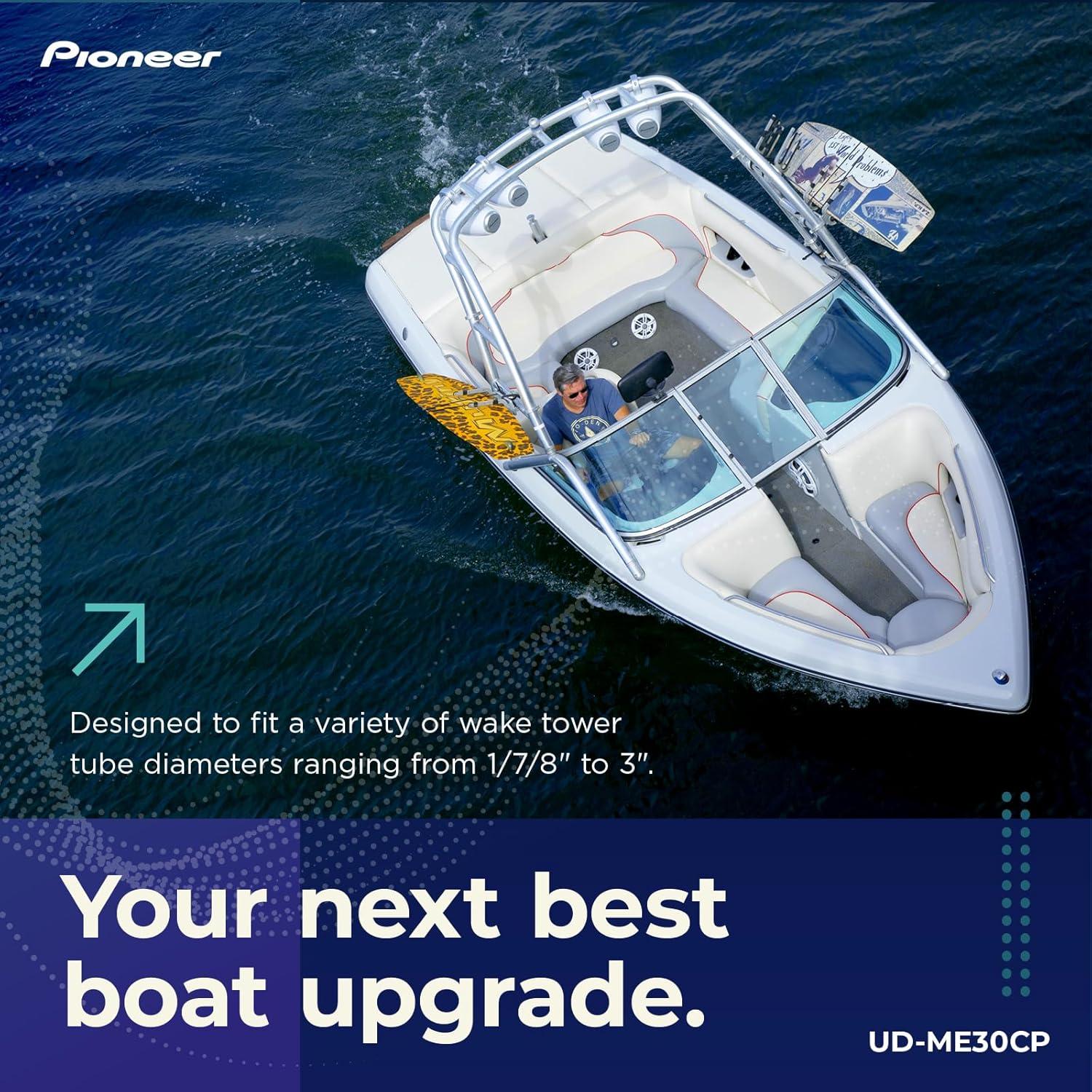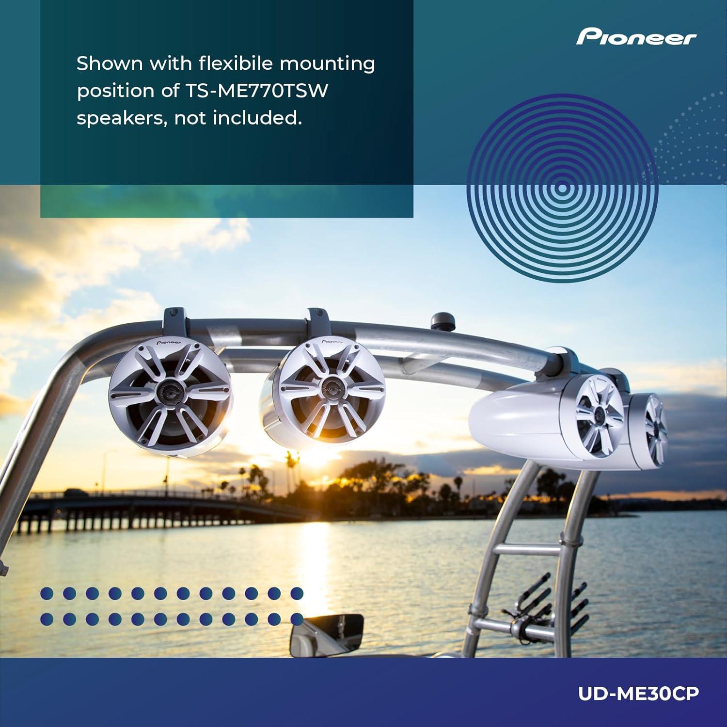 Upgrade your on-water entertainment with Pioneer 7.7″ Marine Tower Speakers, engineered for high-performance audio, durability, and style. With 250W max power, these wakeboard speakers deliver clear, powerful sound that cuts through wind and water, ensuring an immersive audio experience on your boat. Designed to endure harsh marine conditions, they feature an IPX7 waterproof rating and UV-resistant build, making them ideal for long-term outdoor use. Designed for exceptional sound, the speakers’ wide 42 Hz – 23 kHz frequency range and 90 dB efficiency provide deep bass, dynamic mids, and crisp highs, making them ideal for high-energy boating adventures. The integrated RGB LED lighting adds a stylish touch, enhancing your boat’s atmosphere (RGB controller not included). For secure and optimal installation, these tower speakers require the UD-ME30CP mounting bracket (sold separately), ensuring a stable fit on boats and wakeboard towers. Not just for boats, these marine-grade speakers are perfect for ATVs, UTVs, RVs, and other outdoor vehicles, delivering premium sound wherever your adventures take you. Elevate your outdoor audio experience with Pioneer’s trusted marine speaker technology—ideal for boaters, wake surfers, and off-road enthusiasts alike.